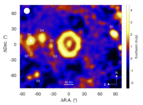 1.1 mm LMT(32 m)/AzTEC continuum map of ε Eridani. The outer ring is fully detected at a significance of >5.7σ. The central peak is detected at 7.5σ and likely corresponds to the sum of three contributing agents: the stellar photosphere, the stellar upper atmosphere and an (or perhaps two) inner warm disk(s). As many as seven (S1-S7) background objects are also detected in this map. The smoothed beam size of 10.9″ FWHM (degraded from the original 8.5″) is given by the white circle in the top-left. As a reference, we include the contour levels for S/N = -3.5, -2, 2, 3.5, 5.0, 6.5, 8.0. (Results from Chávez-Dagostino et al. 2016)