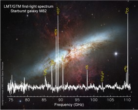 On June 1, 2011, the LMT achieved first light observations at 3 mm using the Redshift Search Receiver (RSR). The first observed target was Messier 82 (M82), a relatively nearby starburst galaxy at a distance of 12 million light years. This type of galaxy undergoes episodes of intense star formation, which in the case of M82 are induced by the gravitational interaction with its companion galaxy M81. The injection of cold gas towards the central region of the galaxy due to its interaction produces large amounts of infrared and millimeter wavelength radiation, which excites the interstellar medium of M82 and results in the emission of molecular lines. The LMT has detected, in only half hour, a large collection of emission lines produced by organic molecules, some of which cannot be generated by nature on the Earth.