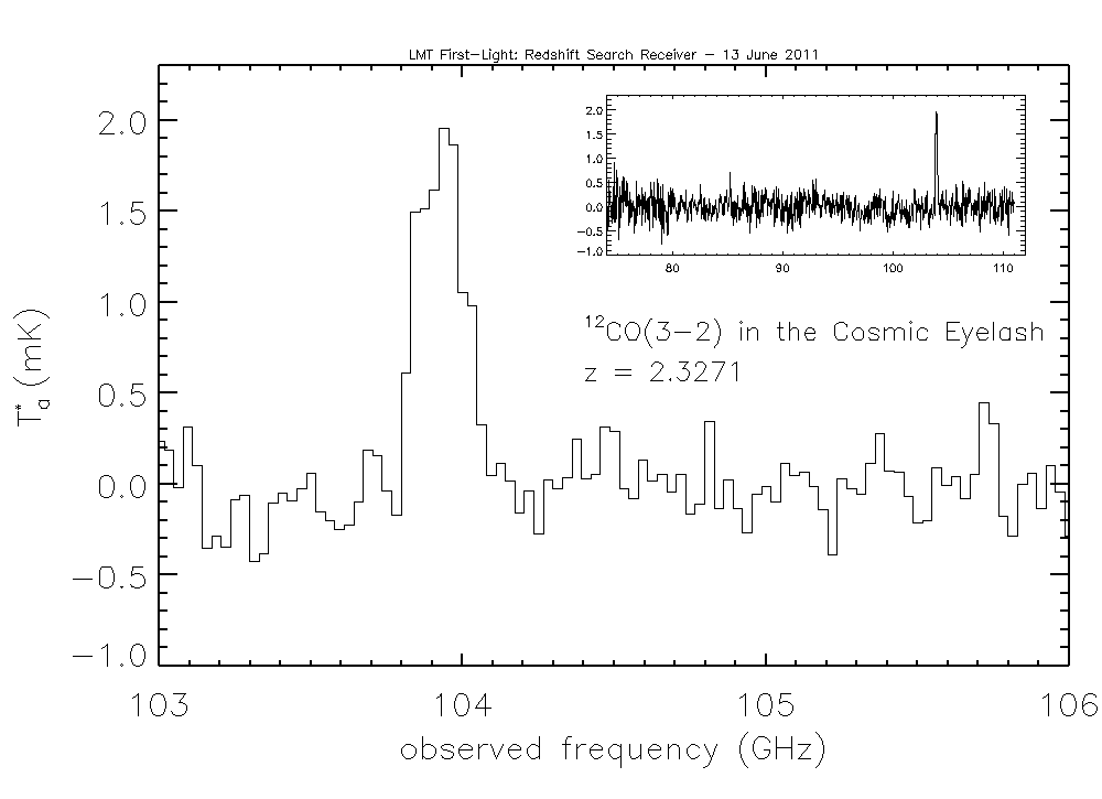 Following the detection of M82, the LMT also measured the mm-wavelength radiation from more distant objects, including the detection of carbon monoxide from the galaxies SMM J2135-0102 (the Cosmic Eyelash) and MM 18423+5938. This rest-frame sub-mm emission was produced when the Universe was only 21 and 12 per cent of its current age respectively. The light from these galaxies is magnified by gravitational lenses in the nearby Universe, massive systems that allow measurements of the amount and distribution of the dark matter.